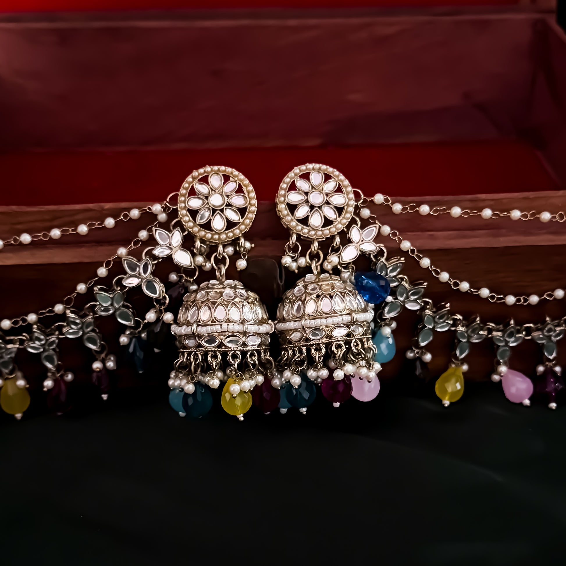 Kashish Jadau Mirror Jhumka Earrings with Sahara/Earchains - Multi
