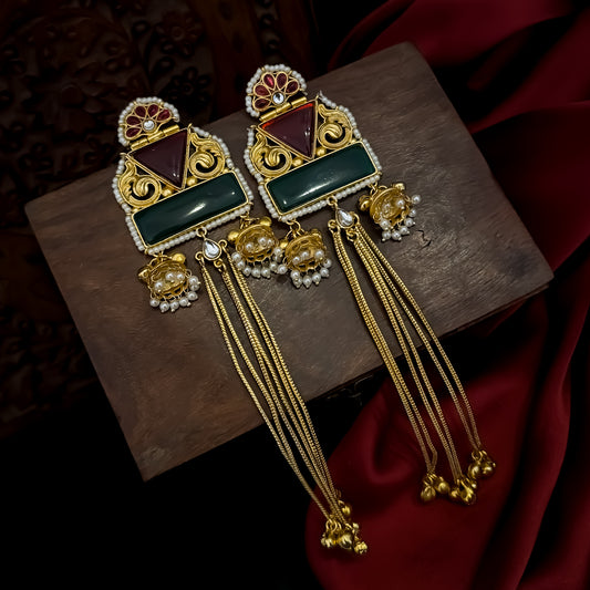Jeenal Kashmiri Brass Ghungroo Earrings - Maroon & Green
