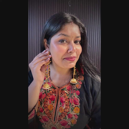 Add a touch of heritage to your look with these Kashmiri Brass Jhumkas, handcrafted in premium oxidized brass with delicate ghungroo detailing. Inspired by traditional Kashmiri designs, these jhumkas are lightweight, nickel-free, and perfect for ethnic wear.