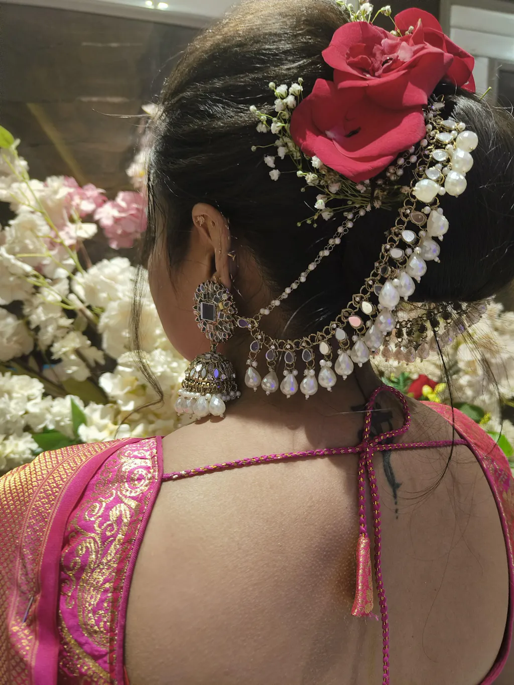 The jhumka earrings feature a traditional bell-shaped design, with a cascading arrangement of small mirrors that reflect light and create a dazzling effect. The mirrors are surrounded by intricate metalwork, such as filigree patterns or floral motifs, adding a touch of elegance and sophistication to the overall design. The earrings are typically suspended from a small chain or a decorative hook, allowing them to sway gracefully with every movement.