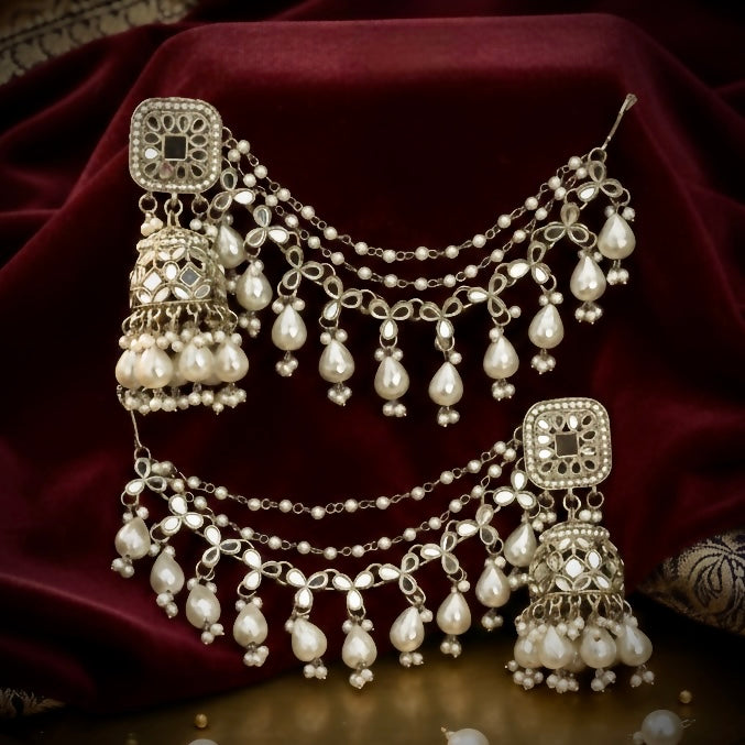 Mishika Mirror Jhumka Earrings with Sahara/Earchains - Golden