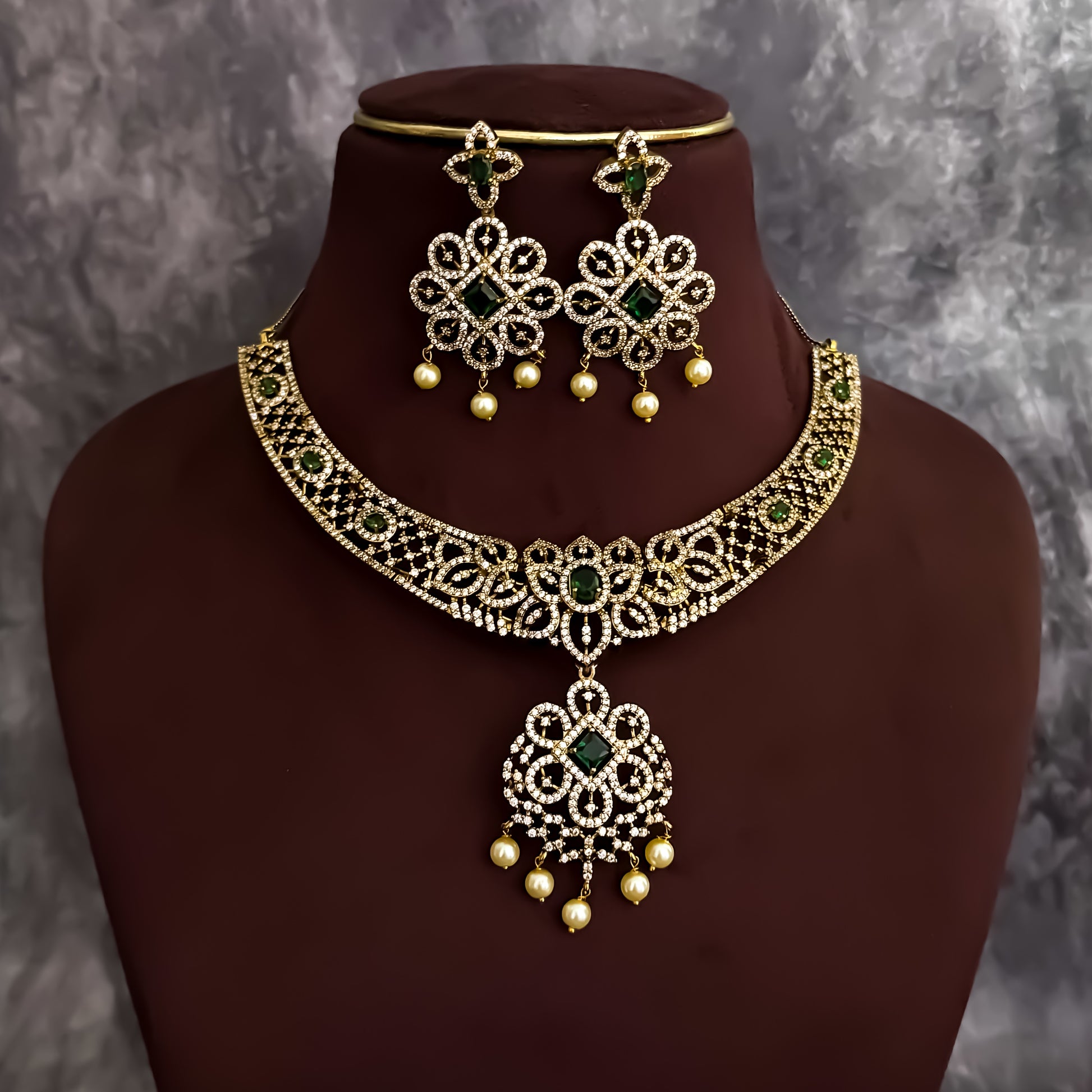 Add timeless South Indian elegance to your look with our Nandini Green AD Necklace Set. Crafted with sparkling American diamonds, traditional pink and green stones, and finished in antique gold polish, this Hasli-style necklace beautifully complements Kanjeevaram sarees, bridal wear, and festive ensembles. A perfect pick for weddings, temple occasions, or classical dance performances, this statement South Indian necklace set is a must-have for lovers of heritage jewelry.