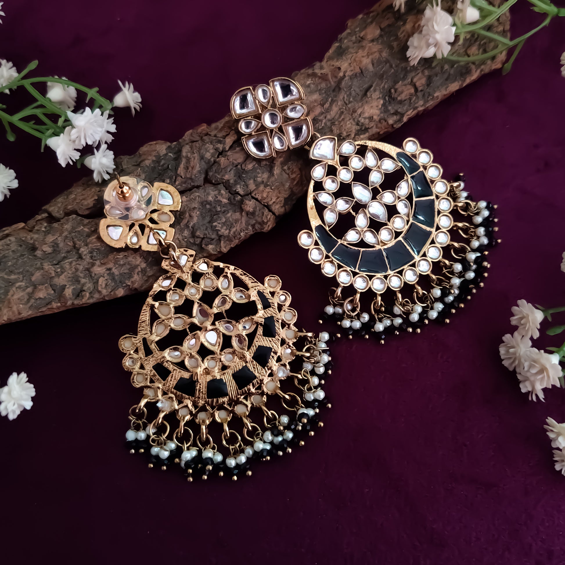 Grace meets glamour in this stunning black Chandbali, adorned with classic Kundan work and delicate pearl drops. Perfect for festive and wedding looks, it adds a bold, regal touch to any outfit.