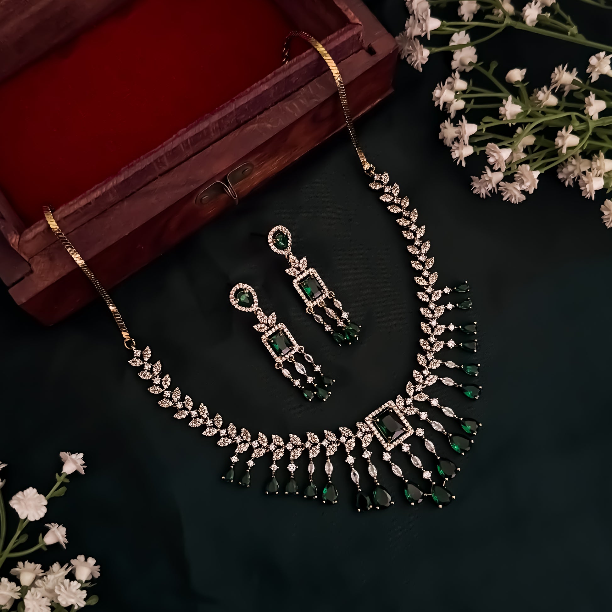 Add timeless South Indian elegance to your look with our Nitara AD Necklace Set. Crafted with sparkling American diamonds, traditional green stones, and finished in antique gold polish, this style necklace beautifully complements Kanjeevaram sarees, bridal wear, and festive ensembles. A perfect pick for weddings, temple occasions, or classical dance performances, this statement South Indian necklace set is a must-have for lovers of heritage jewelry.