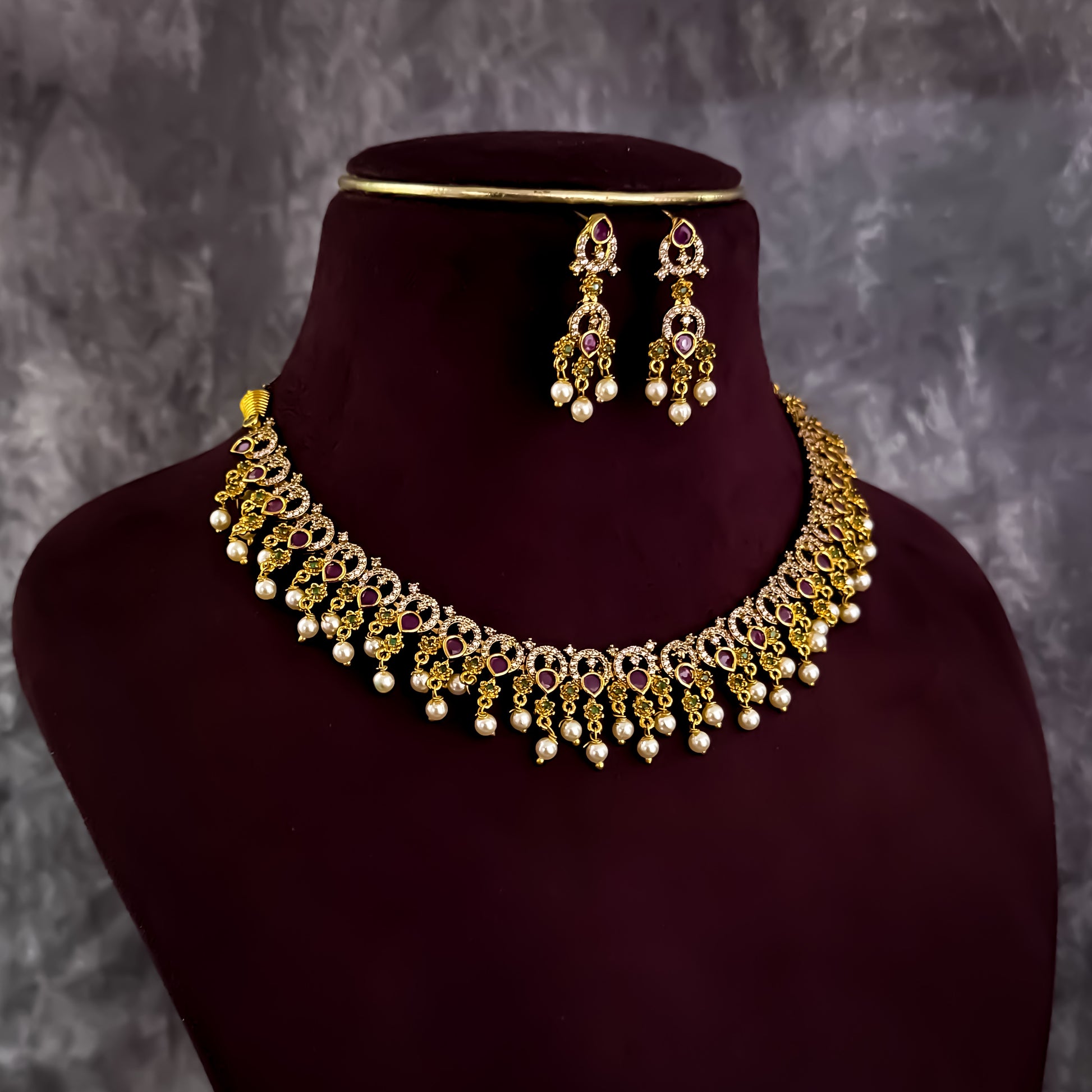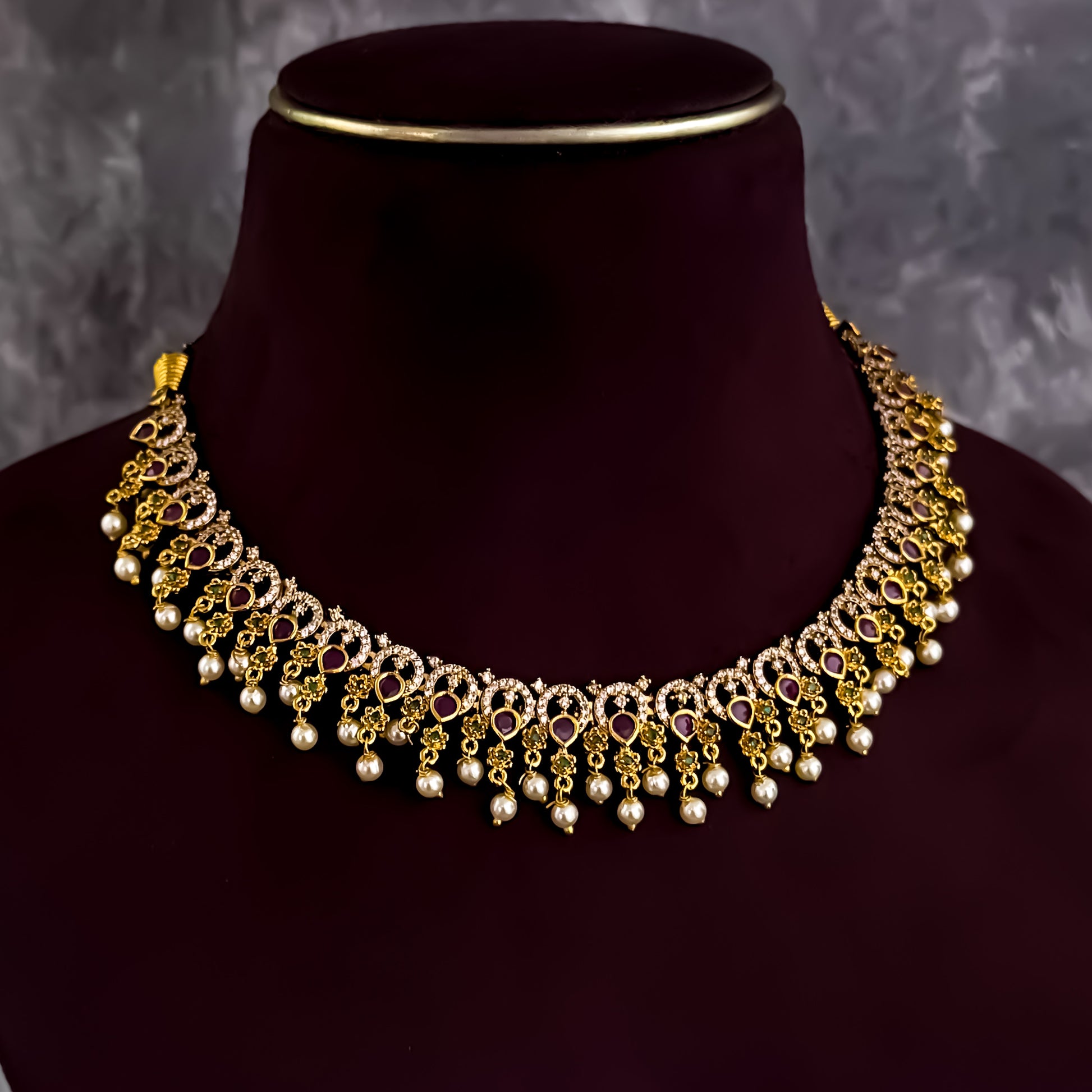 A regal temple necklace set featuring intricate golden detailing with striking green accents. Perfect for weddings, festive occasions, and traditional ensembles, this timeless piece adds elegance and divine charm to your look.