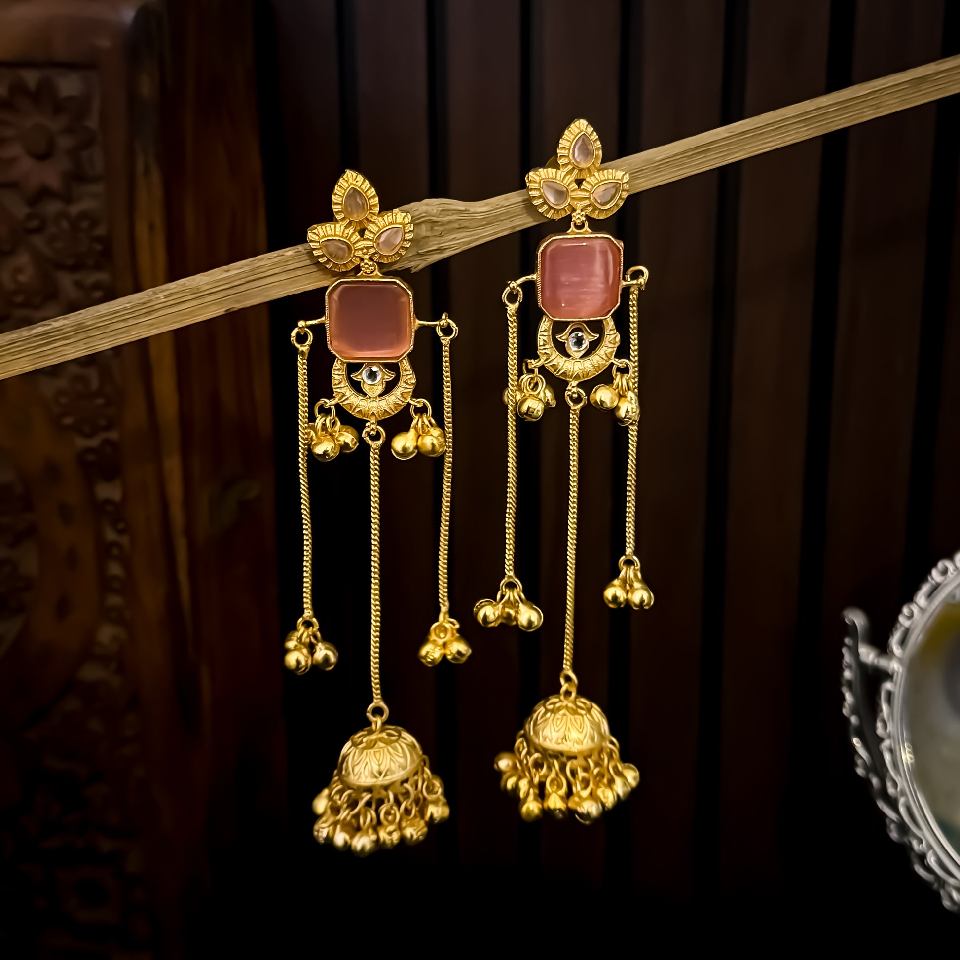 Rushda Jadau Mirror Jhumka Earrings with Sahara/Earchains - Golden