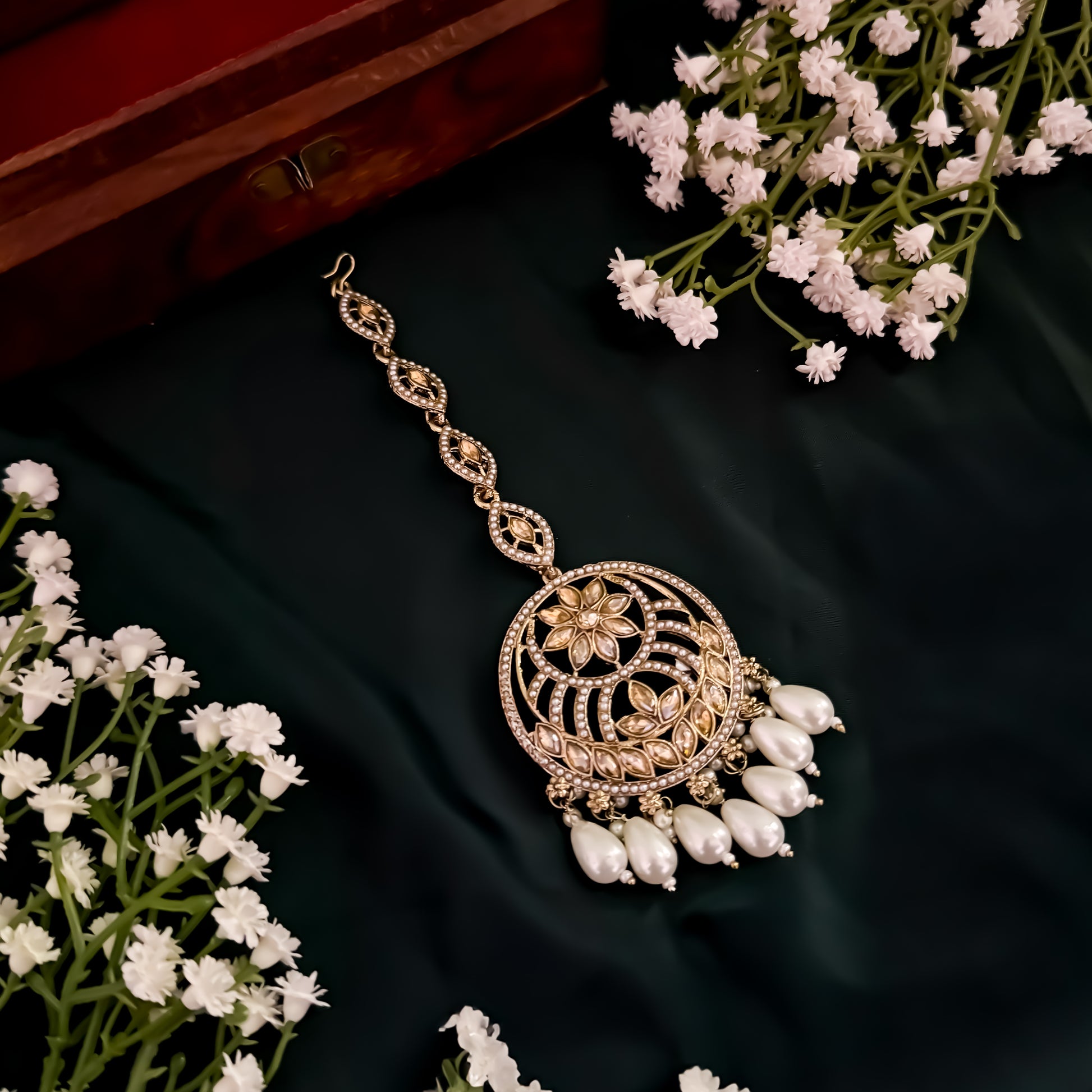 Elevate your traditional look with this exquisite Jadau Teeka, featuring intricate Jadau craftsmanship. A timeless piece that adds royal charm to your ensemble, perfect for weddings and festive occasions.