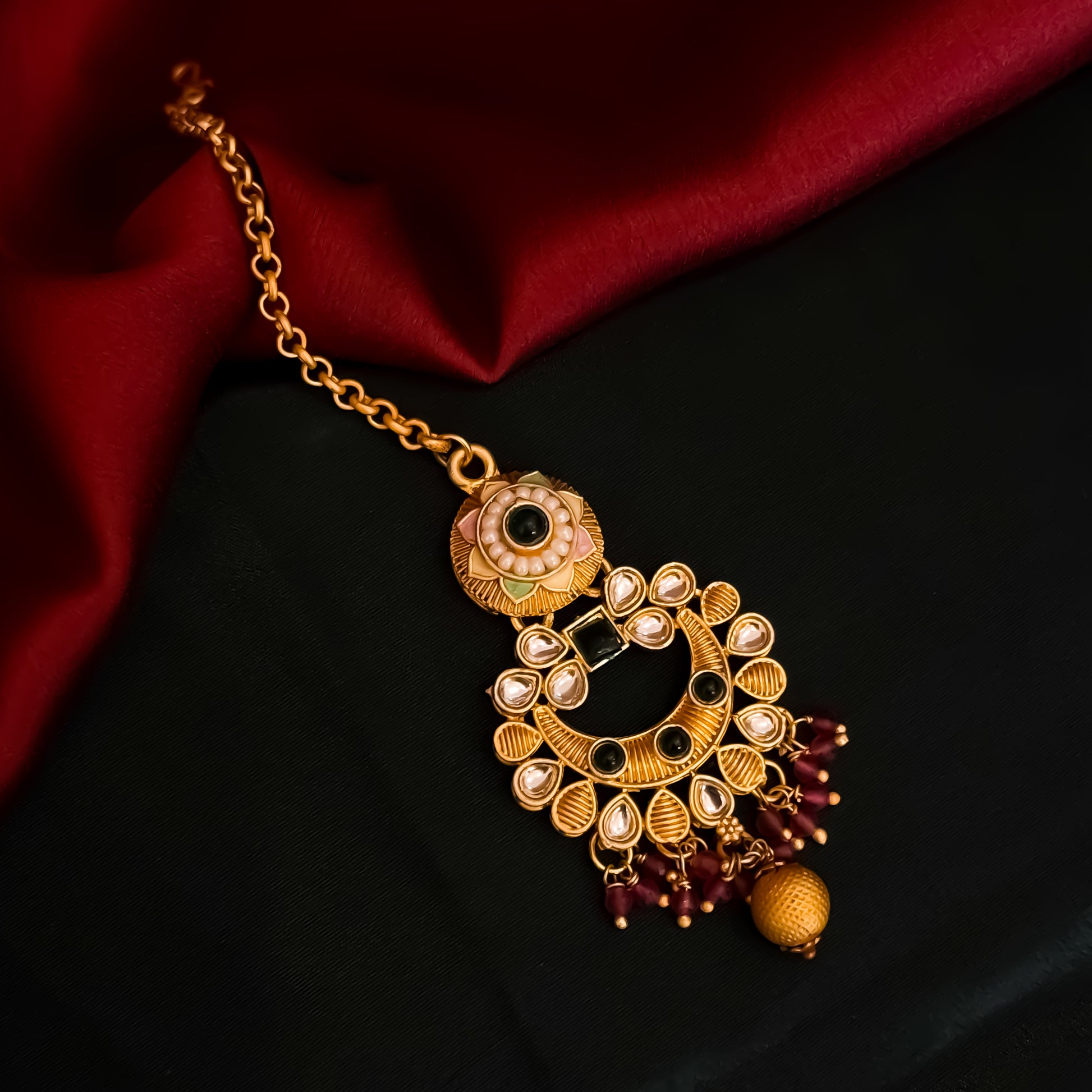 The intricate detailing, paired with its antique-inspired design, makes it perfect for wedding functions, festive celebrations, or royal-themed occasions. The set comes with a beautifully coordinated pair of earrings that complete the look with grace.