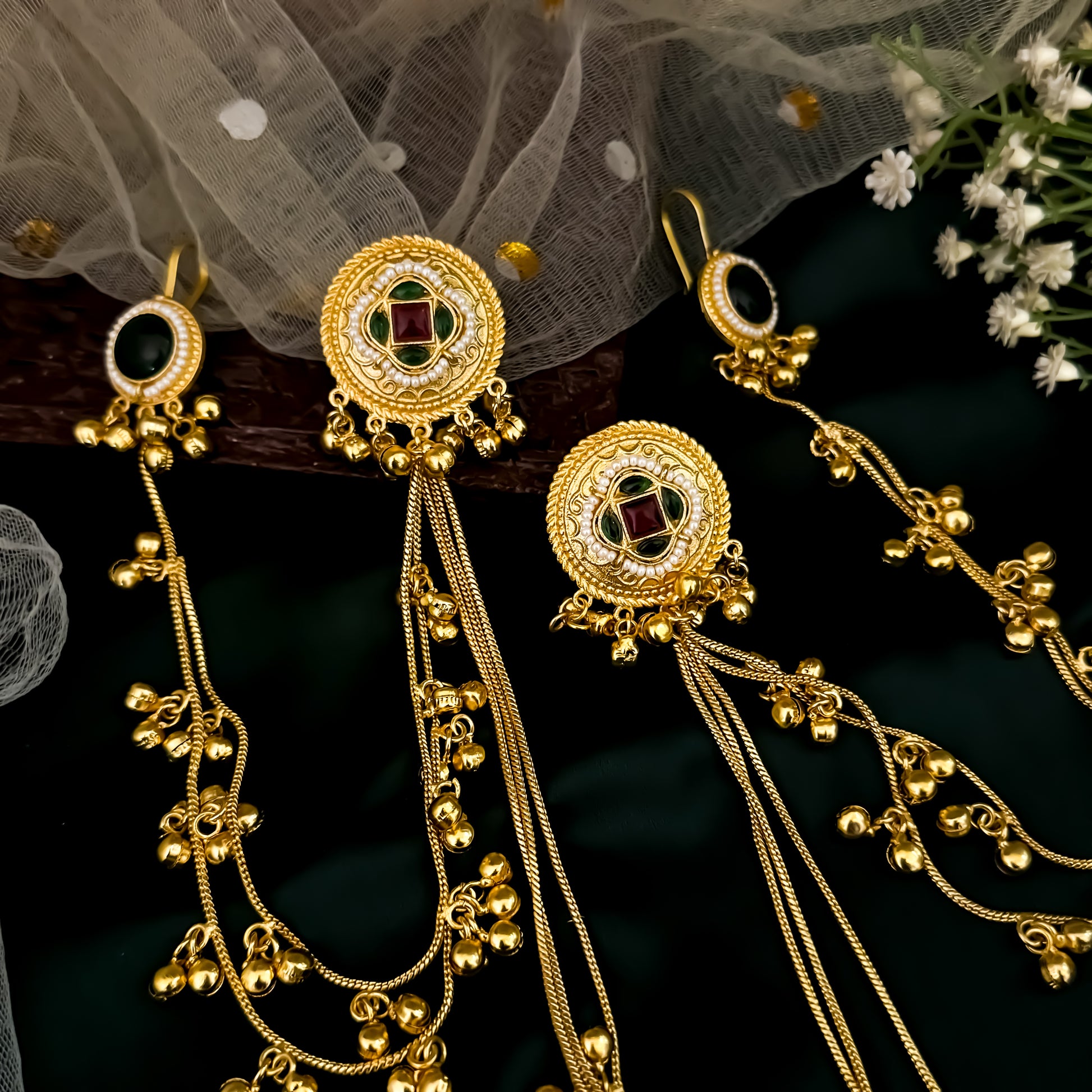 Kashi Kundan Jhumka Earrings with Sahara/Earchains - Golden