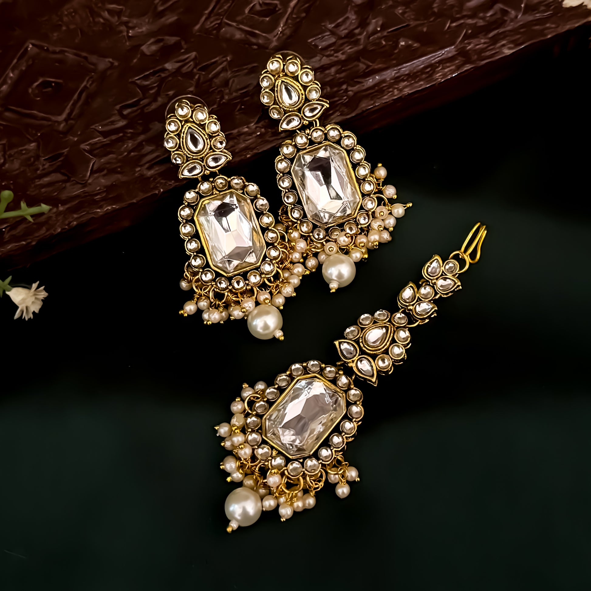 Mahtaab Jadau Reverse AD Jhumka Earrings with Earchain & Teeka - Multi