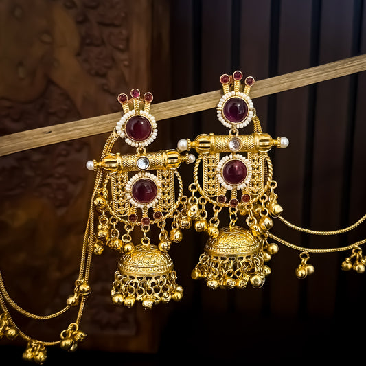 Madhumika Kashmiri Jhumka with Earchain Ghunghroo Earrings - Ruby