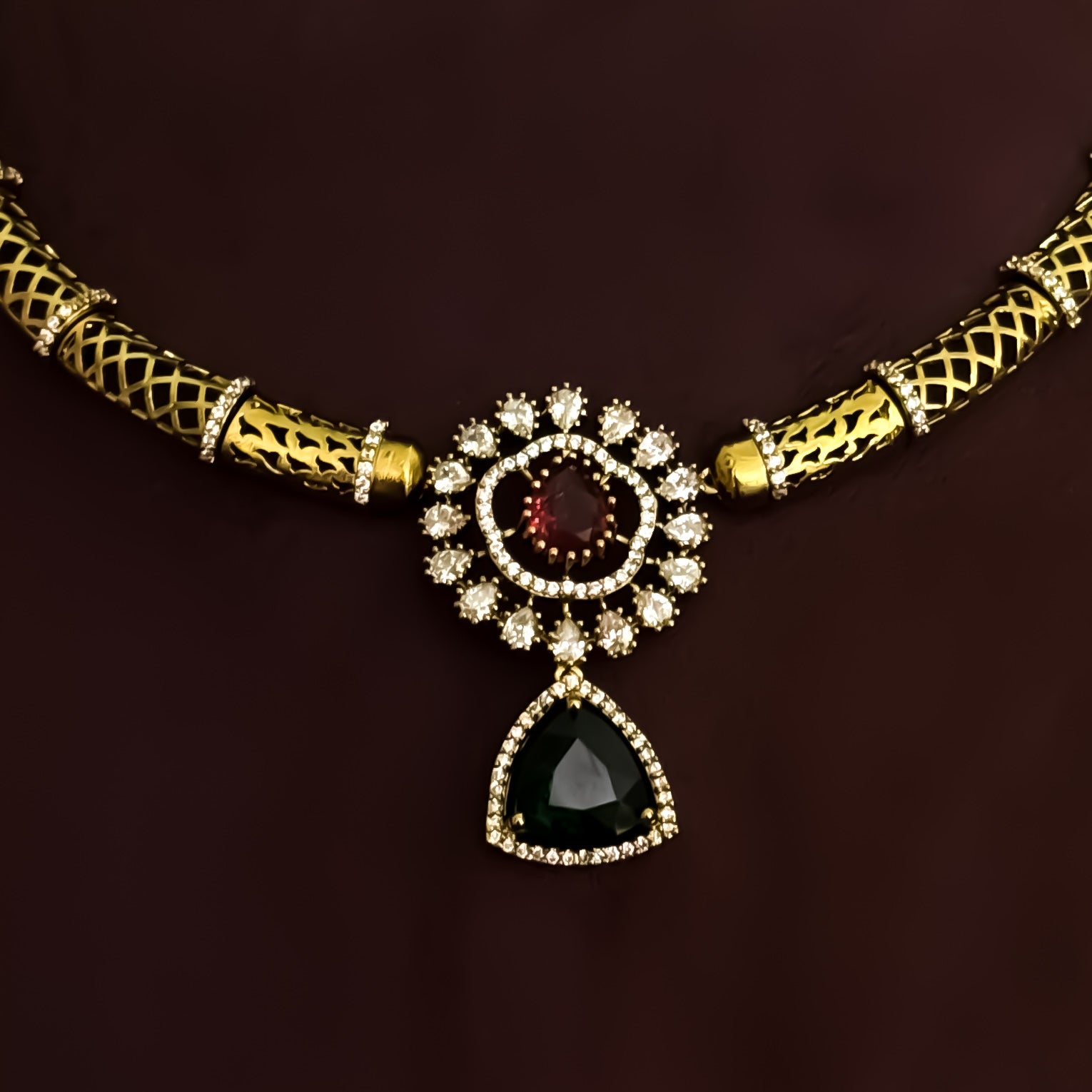 Srijya Victorian Work Pink & Green AD Hasli Necklace Set