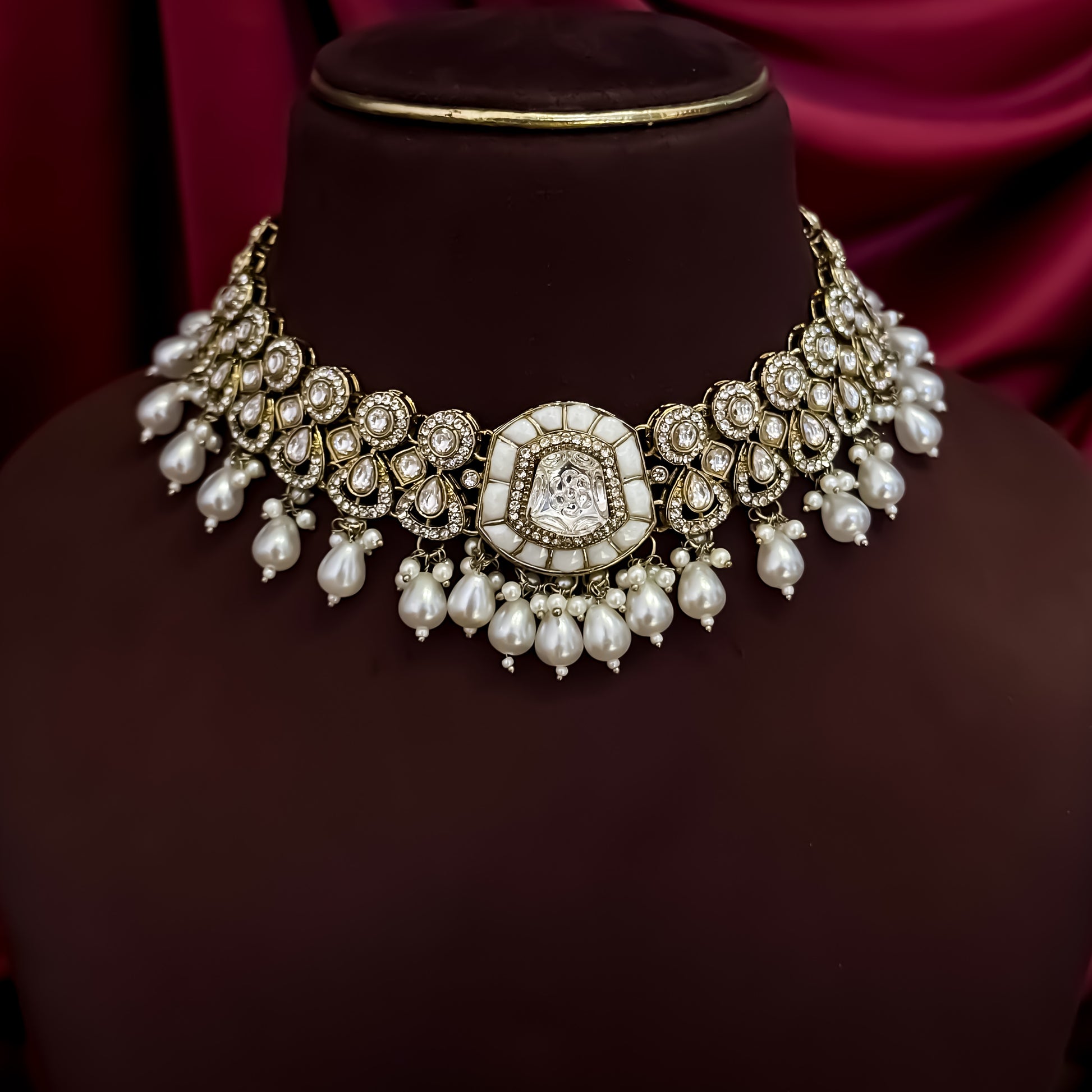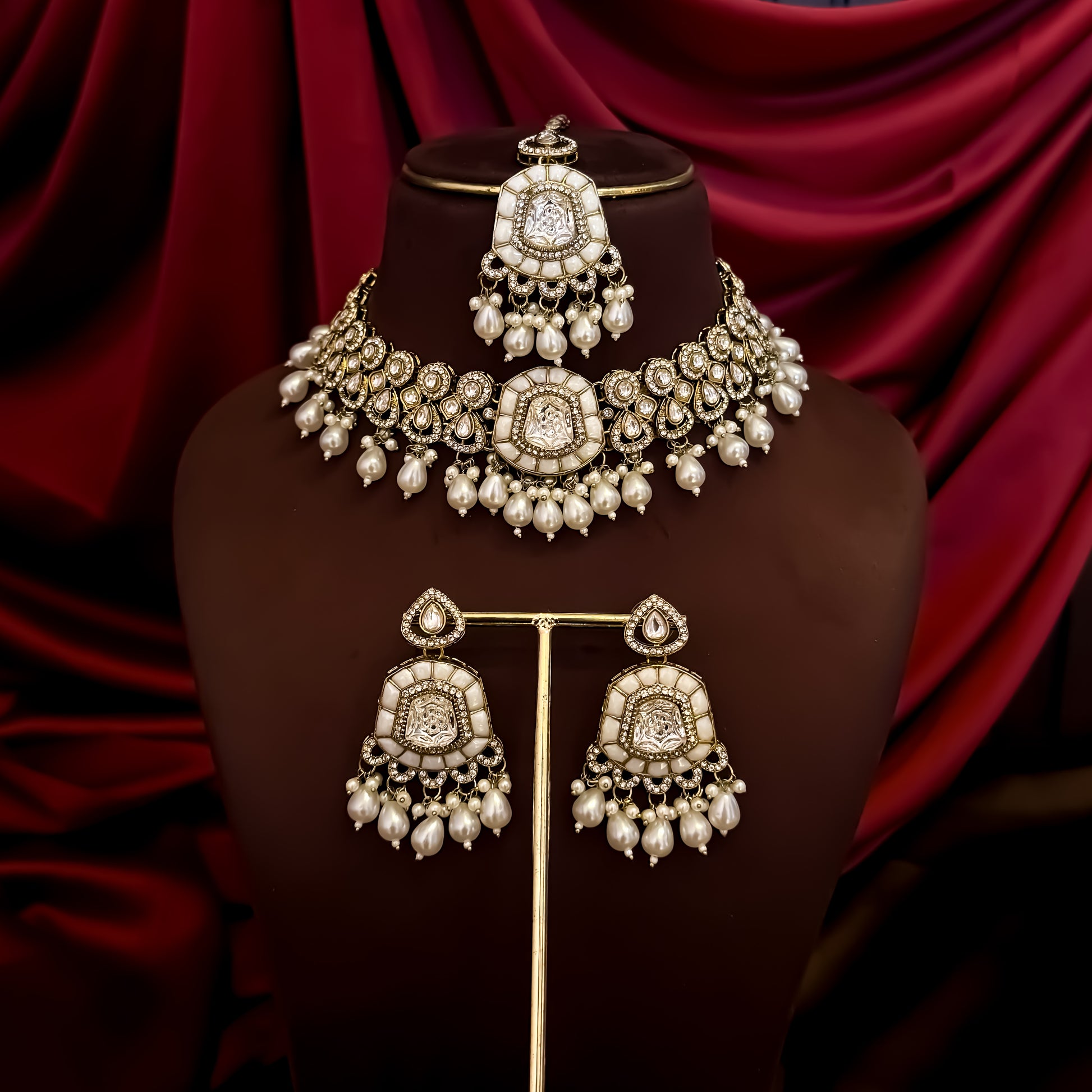 The detailed setting, refined finish, and statement silhouette make it perfect for weddings, receptions, festive celebrations, and bridal functions. Paired with matching earrings, this set effortlessly frames your neckline and adds a luminous glow to any ethnic ensemble — from lehengas to sarees and even contemporary fusion outfits.