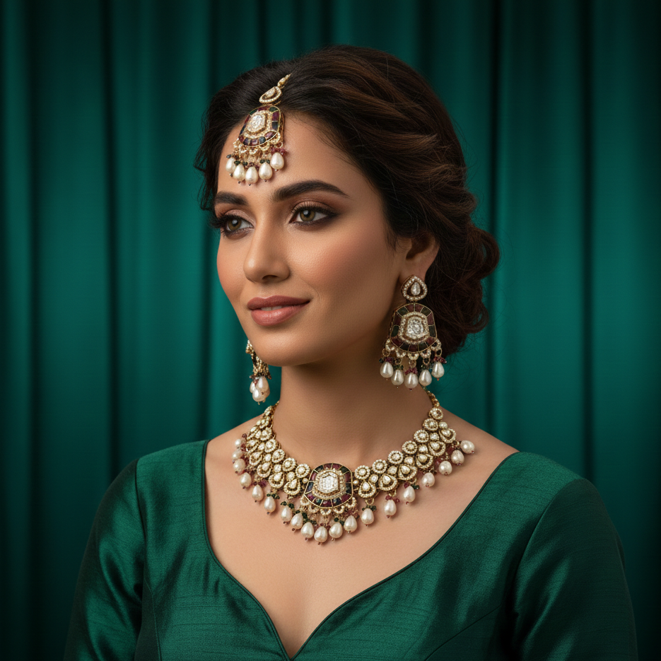The detailed setting, refined finish, and statement silhouette make it perfect for weddings, receptions, festive celebrations, and bridal functions. Paired with matching earrings, this set effortlessly frames your neckline and adds a luminous glow to any ethnic ensemble — from lehengas to sarees and even contemporary fusion outfits.