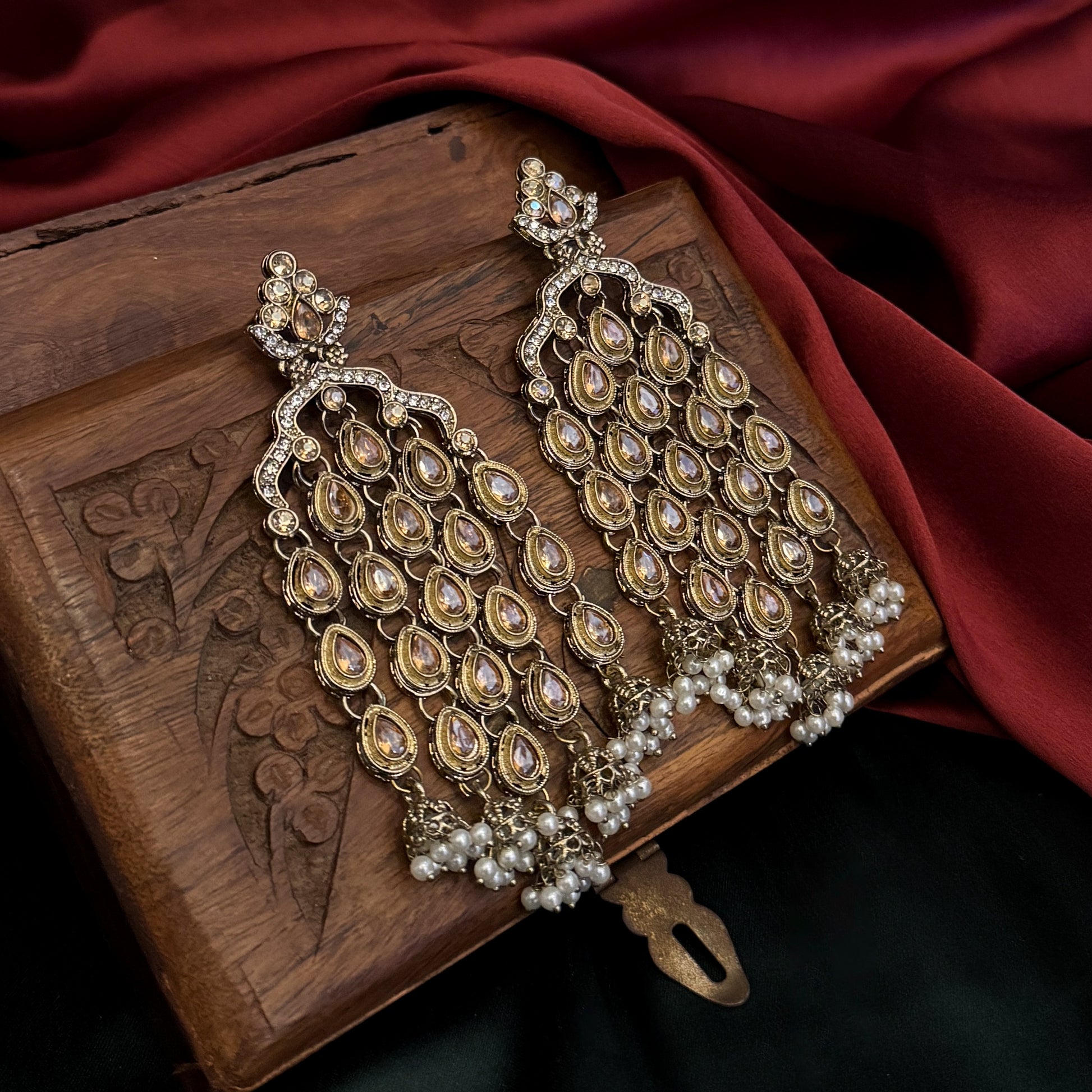 Saira Pearl Peacock Chandbali Earrings with Sahara/Earchains