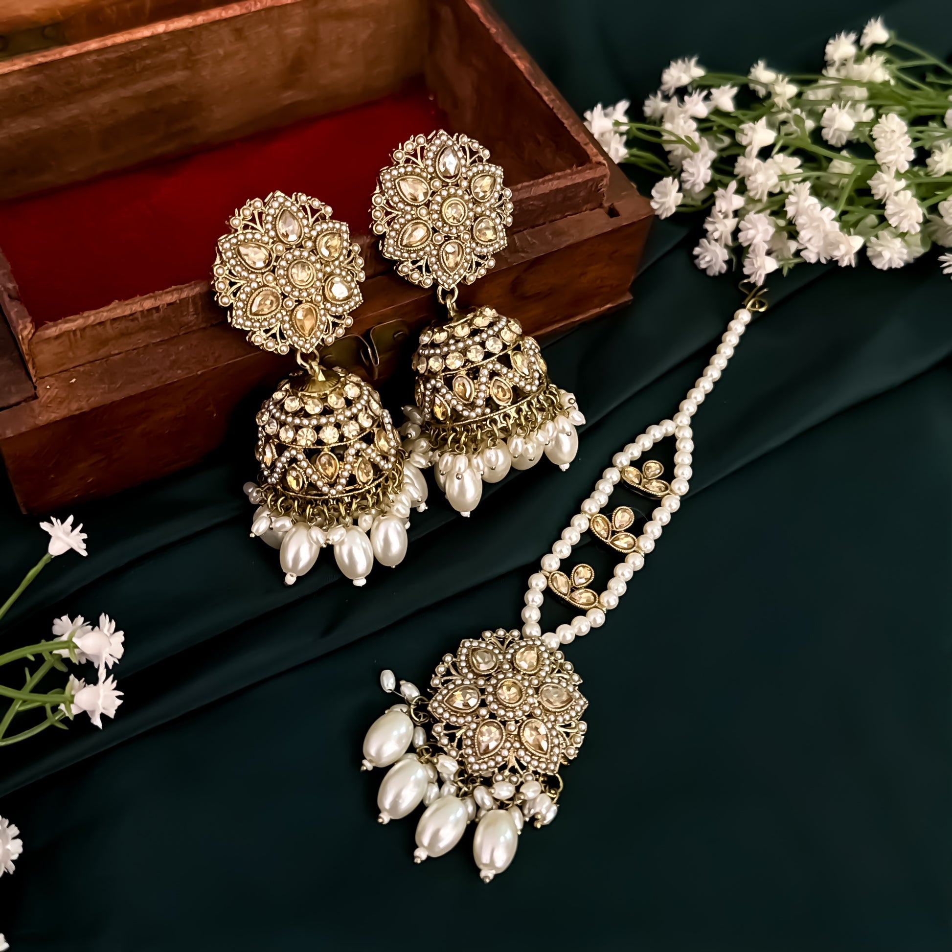 Rani Padmavat Jadau Jhumka Earrings with Sahara & Teeka - Golden