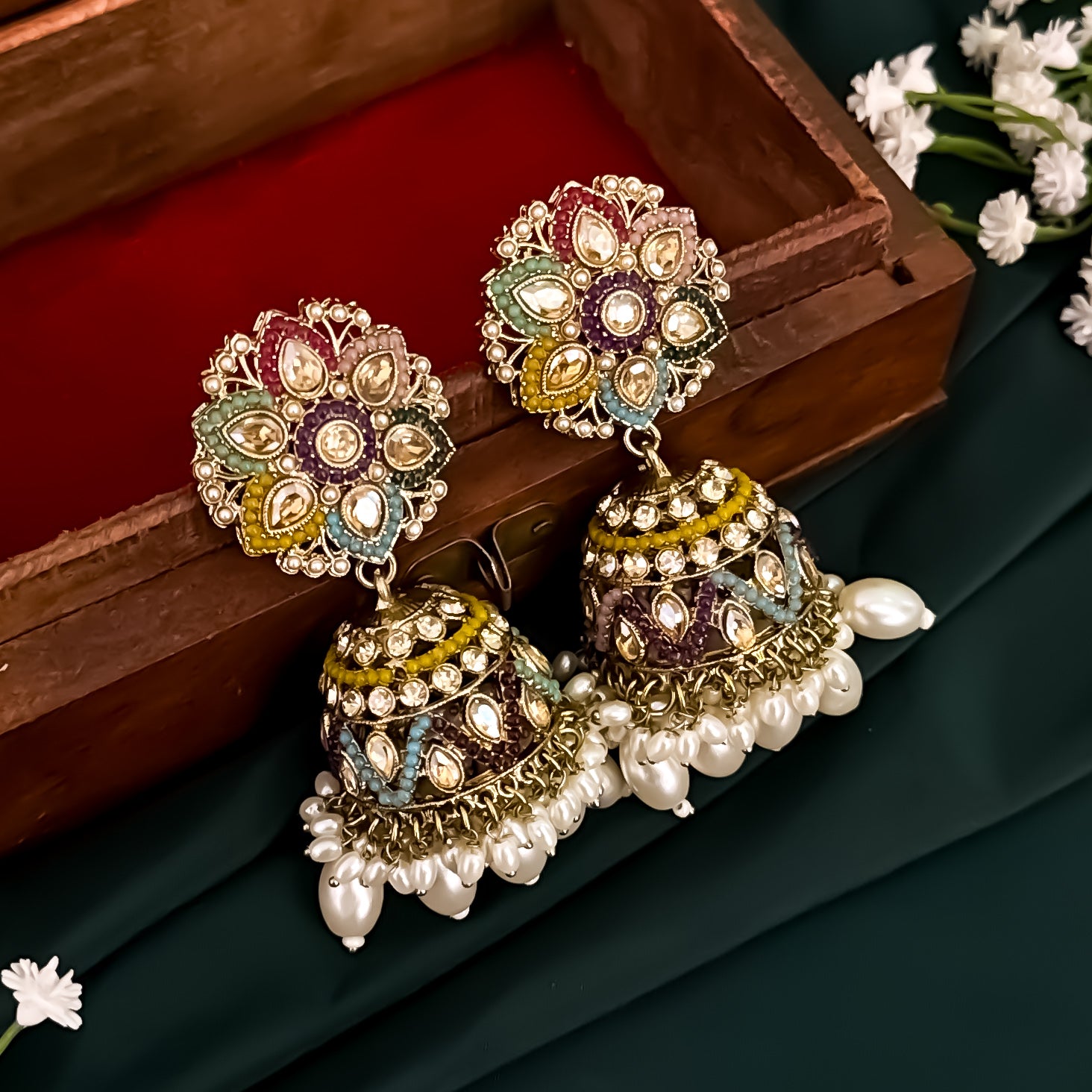 Lasika Jadau Jhumka Earrings with Sahara/Earchains - Multi