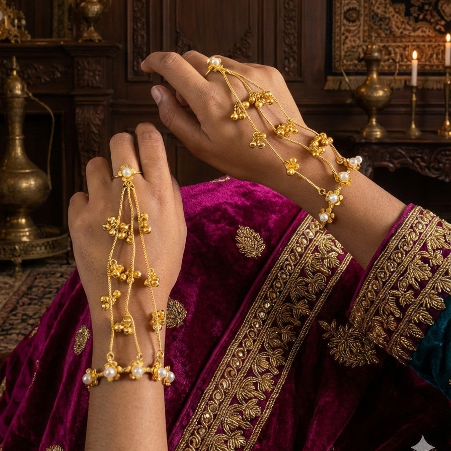 A graceful blend of heritage and elegance, the Vasvi Floral Kashmiri Haathphool is crafted to make your hands look nothing short of regal. Inspired by traditional Kashmiri artistry, this golden brass haathphool features delicate floral motifs that beautifully connect the ring to the bracelet, creating a timeless statement.