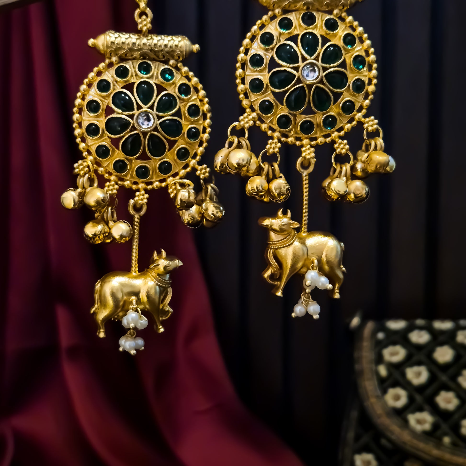 Jeenal Kashmiri Brass Ghungroo Earrings - Maroon & Green