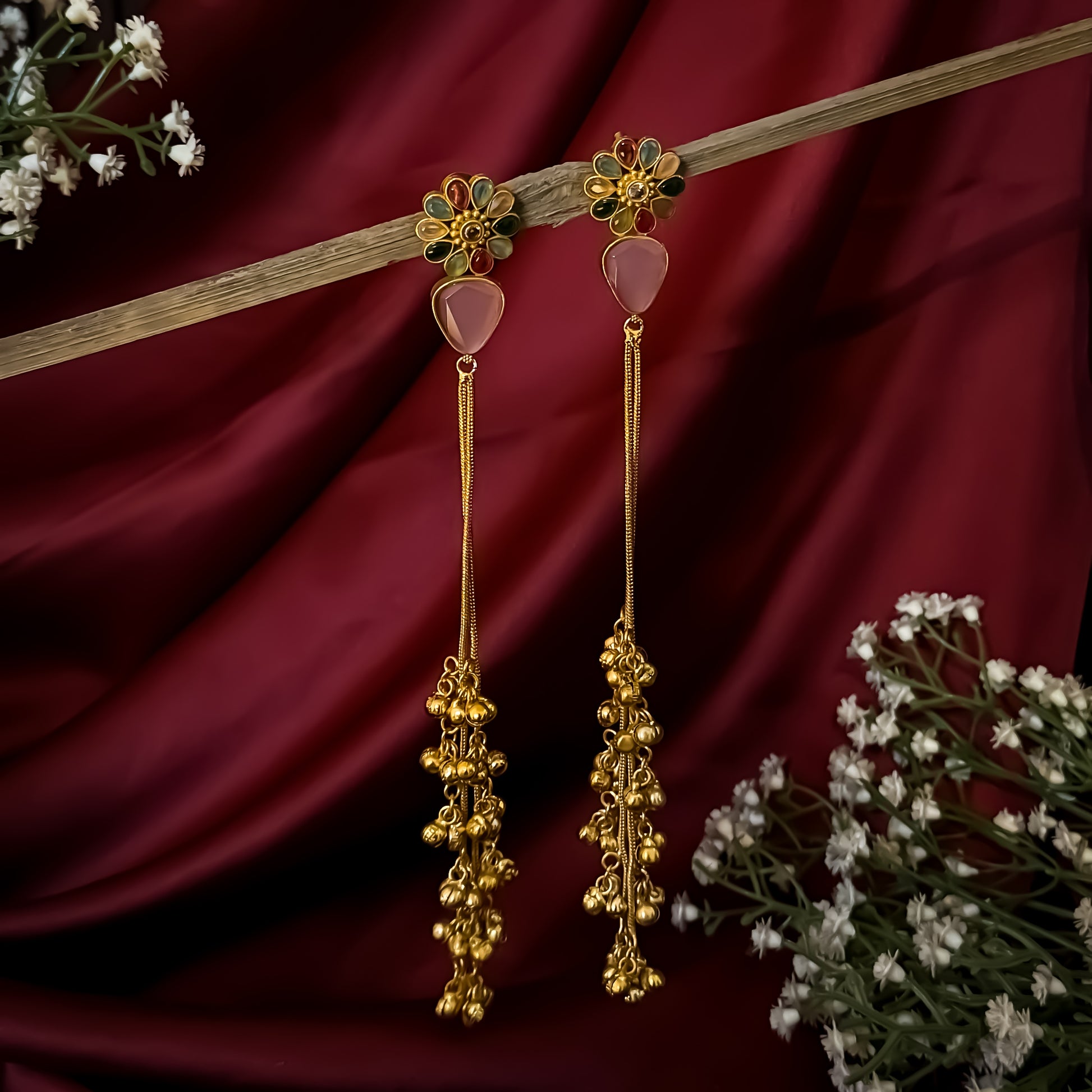 Sunehri Lotus Premium Kashmiri Brass Earrings with Sahara/Earchains - Pink & Golden