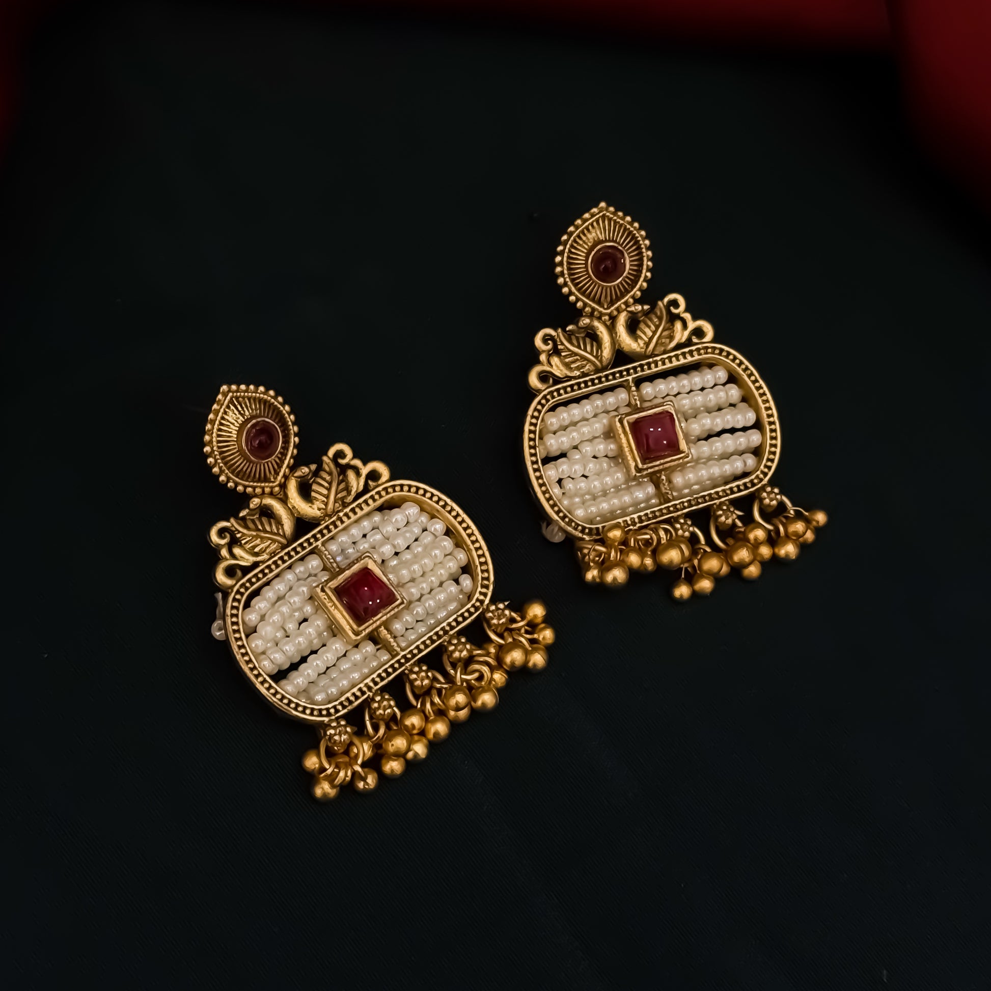 The intricate detailing, paired with its antique-inspired design, makes it perfect for wedding functions, festive celebrations, or royal-themed occasions. The set comes with a beautifully coordinated pair of earrings that complete the look with grace.